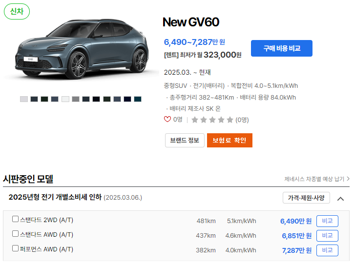 인기 차종은 GV60의 스탠다드 AWD 모델입니다.