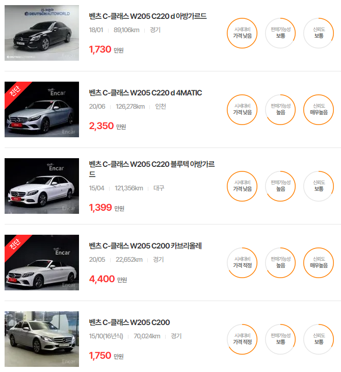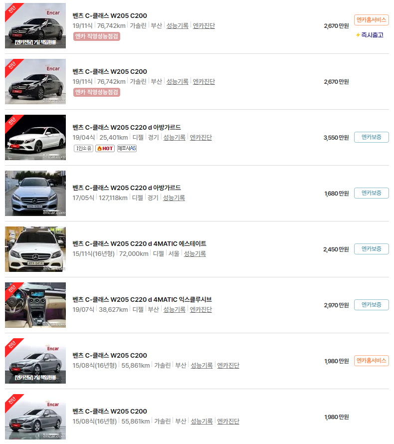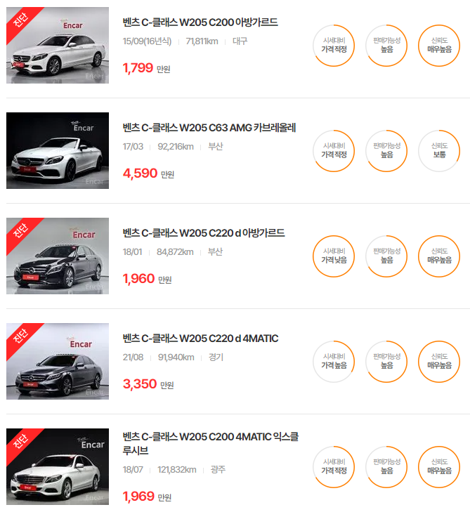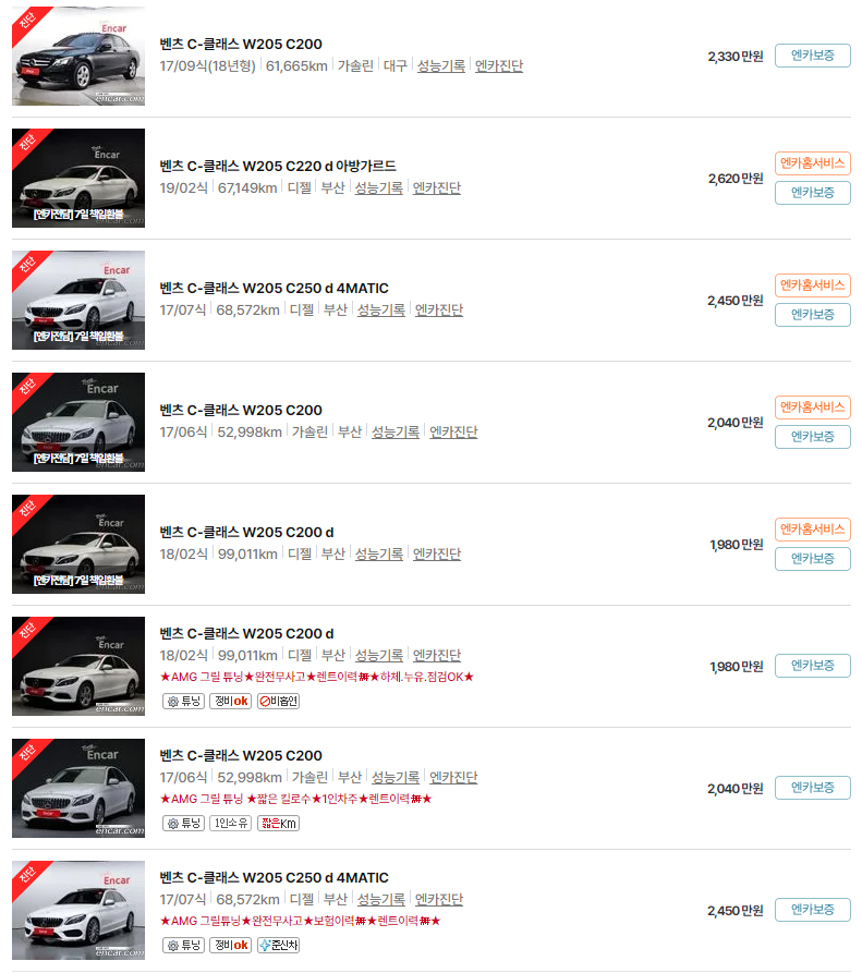 W205는 다양한 주행거리와 옵션에 따라 폭넓은 가격대가 형성되어 있으며, 특히 2020년식 이전의 모델은 실제 매물 시세를 확인하려면 거래 플랫폼 비교가 중요합니다.