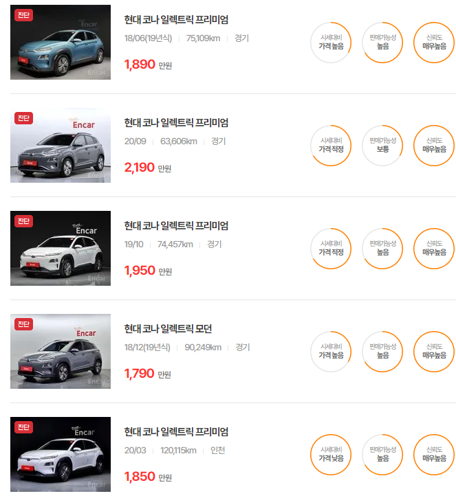 현대 코나 일렉트릭 중고차 가격 시세표