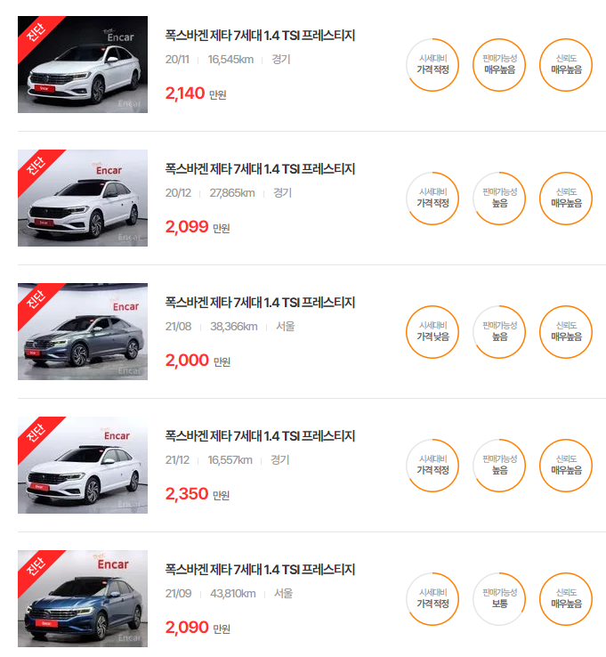 폭스바겐 제타 중고차 가격