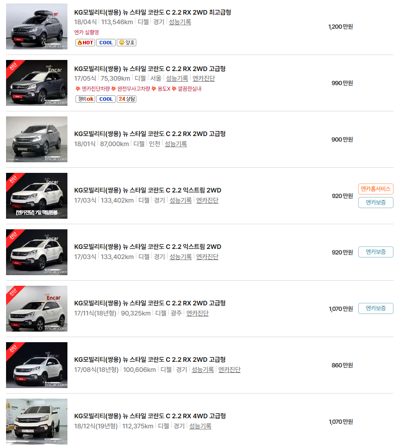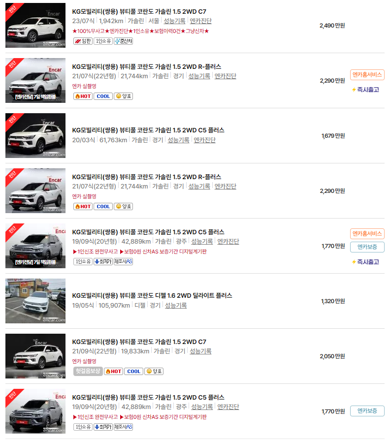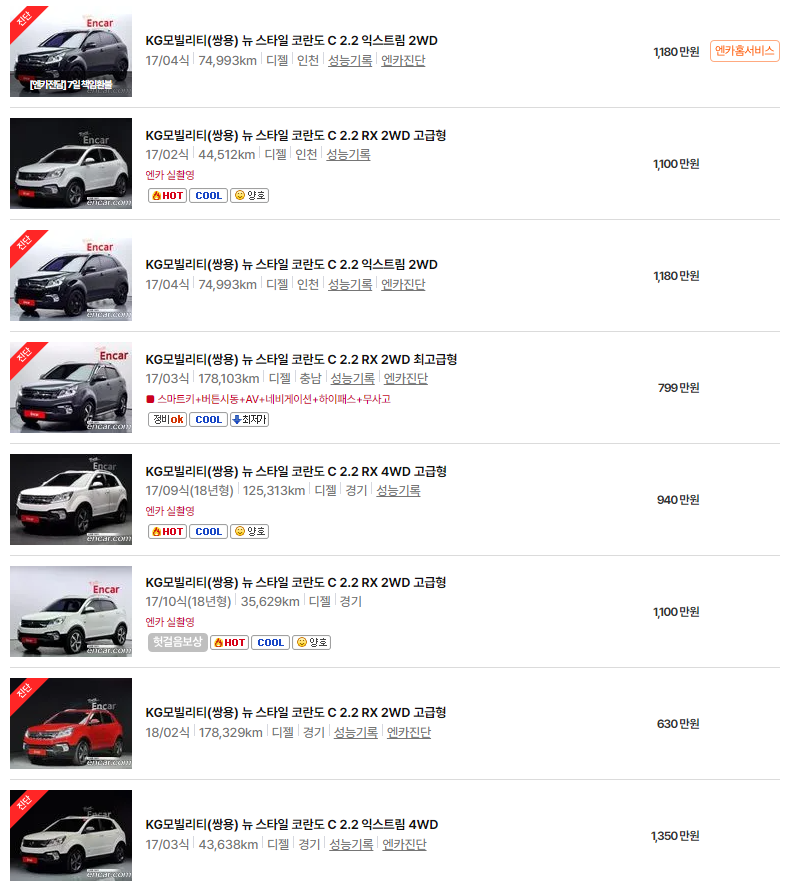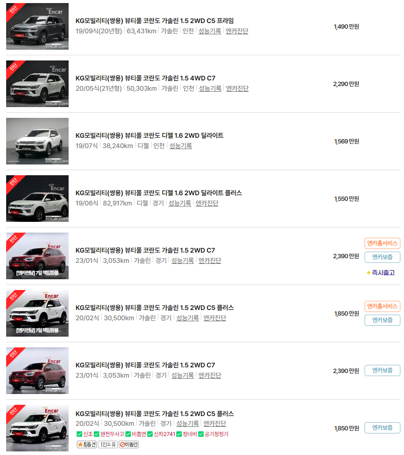 항상 업데이트되는 중고차 정보를 통해, 합리적인 가격과 적합한 차량을 찾아보시기 바랍니다. KGM 코란도와 유사한 성능을 갖춘 차량들도 꼭 확인해보세요.