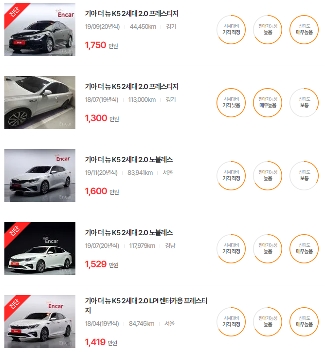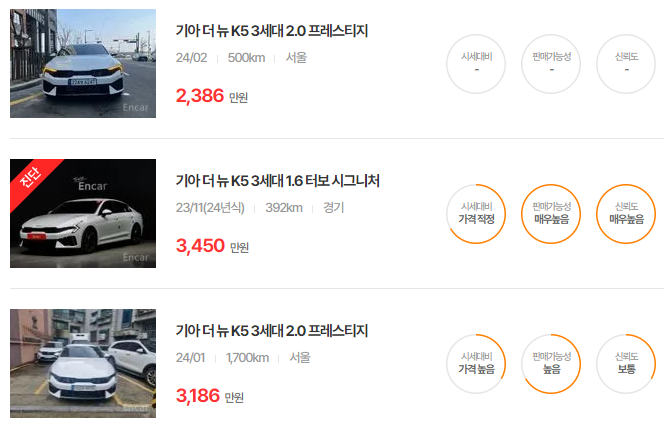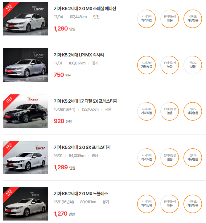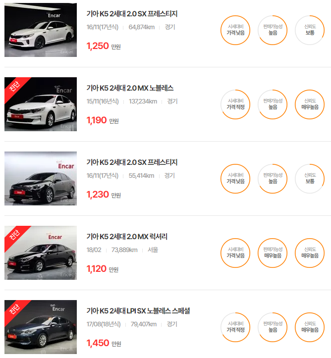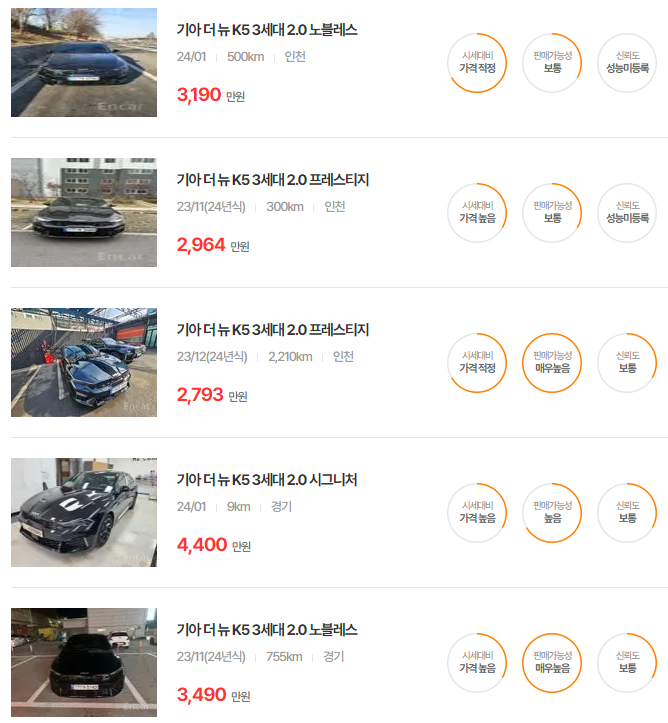 이전 세대인 3세대 K5는 탄탄한 성능으로 꾸준히 인기를 유지하고 있으며, 주행거리 기준으로도 합리적인 가격대를 형성하고 있습니다.