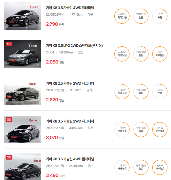 더 뉴 K8은 최신 모델답게 높은 가격대를 유지하고 있으며, 프리미엄 트림과 주행거리, 옵션에 따라 가격 차이가 발생합니다.