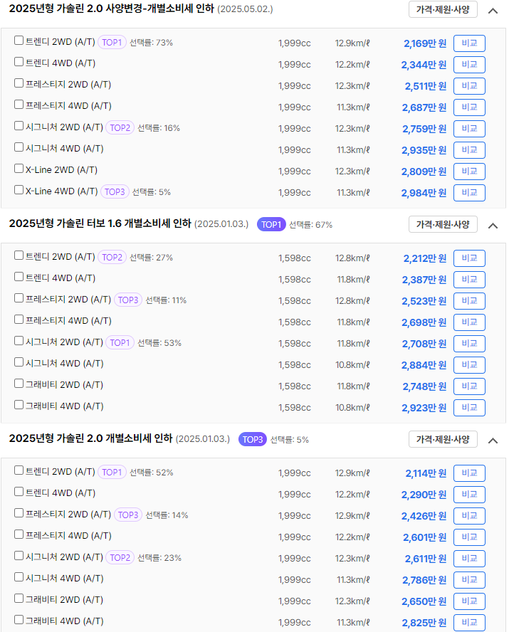 - 가격은 트림 및 선택 옵션에 따라 변동할 수 있으며, 개별소비세 인하도 적용됩니다.